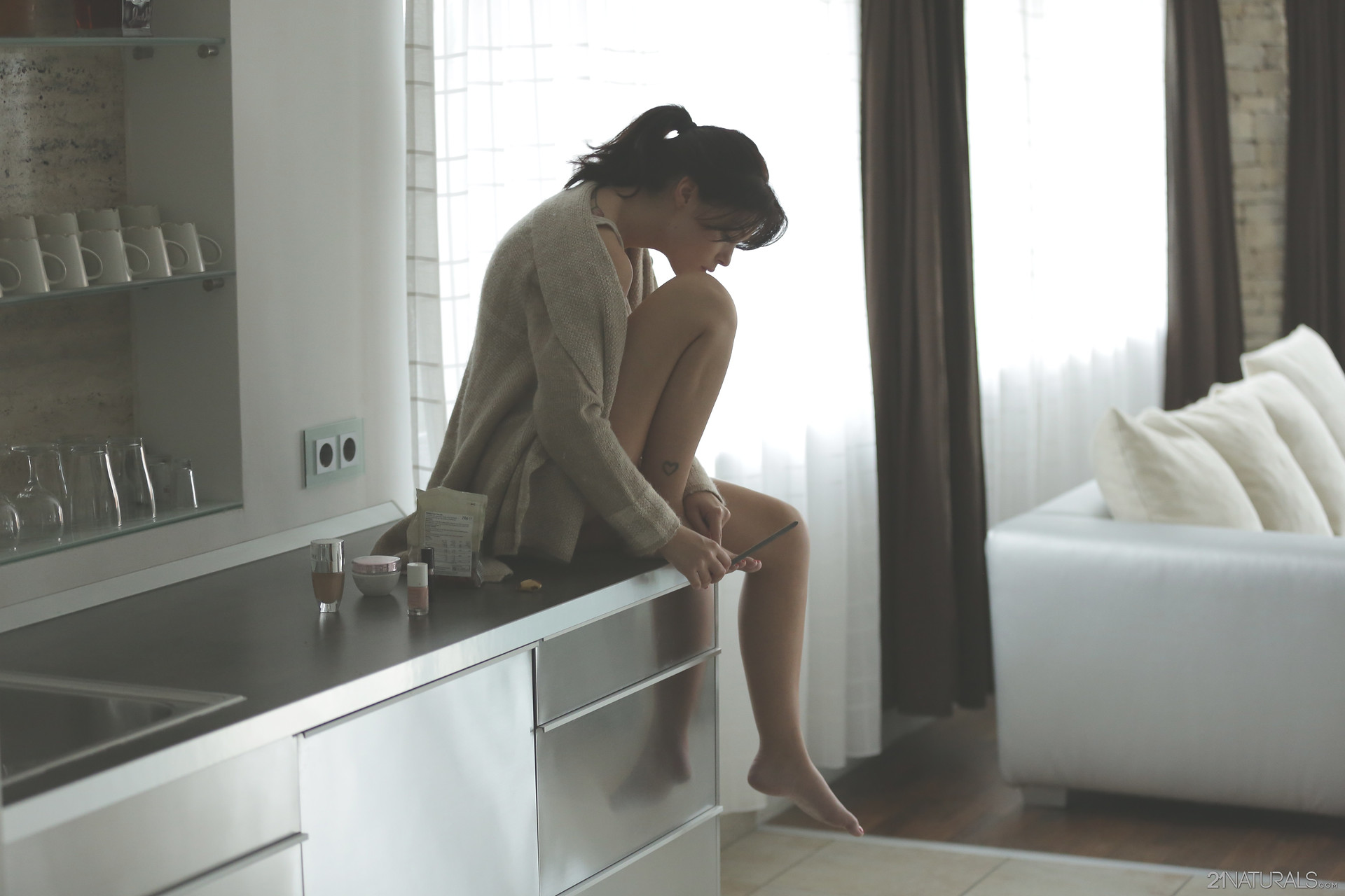 Charlie strips down to her corset, stockings and suspenders to fuck herself with her vibrator in the kitchen.